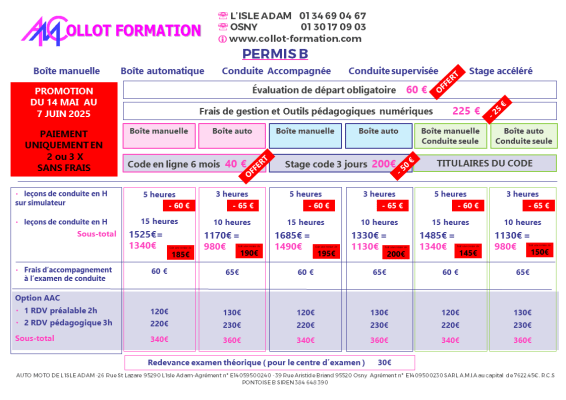 Découvrez l'auto-moto-école Collot à L'Isle-Adam, votre partenaire de confiance pour obtenir votre permis de conduire en toute sérénité. Située au 26 rue Saint-Lazare, notre équipe expérimentée vous accompagne avec passion et professionnalisme. Réussissez votre examen en toute sécurité avec des cours adaptés à vos besoins.